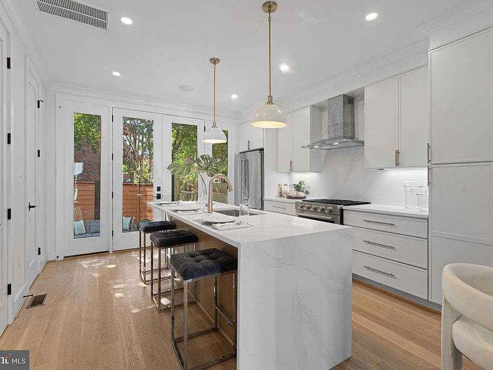Welcome to your urban oasis in LeDroit Park/Shaw, one of DC’s hottest neighborhoods. This fully updated 4-bedroom, 3.5-bath home blends historic character with modern convenience. Designed for today’s urban lifestyle, it offers the freedom to step out for a quick errand, a night on the town, or a leisurely neighborhood stroll—no car required. Inside, the main level offers an open living/ dining area, and goumet kitchen. The kitchen offers sleek slim Shaker cabinetry, a quartz waterfall island, champagne bronze fixtures, stainless steel KitchenAid appliances, and stylish pendant lighting. A chic powder room completes the floor, while 8-ft French doors open to a cozy, privately fenced stone patio. Two primary suites occupy the upper levels. The second-floor suite offers a walk-in closet and a luxurious bath with an oversized glass-enclosed shower, rain showerhead, modern, porcelain tiles and a built-in seat. Also on this floor is a second bedroom with generous closets , and a laundry room with a stack washer-dryer. The third-floor suite, reached by a sky-lit staircase, features soaring 10-ft ceilings, a wall of closets, and its own ensuite bath. An additional bedroom with an adjoining bath completes the level. The finished lower level room provides a versatile bonus room with additional closets, and can be used as a workout or office space. The residence features 9 ft ceilings, 8-ft doors, recessed lighting, 5” white oak floors, built-in speakers, and a security system with Ring camera. With a 98 Walk Score, Shaw Metro, and bus lines in close proximity, this home puts dining, shopping, and nightlife at your doorstep. Explore the U Street Corridor, Howard University, Banneker Recreation Center, Landmark Atlantic Plumbing Cinema, Trader Joes, Whole Foods, and more. Seller will consider rate buydown with strong offer! If you’re looking for character, modern amenities and an unbeatable location, this LeDroit Park gem is city living at its best.