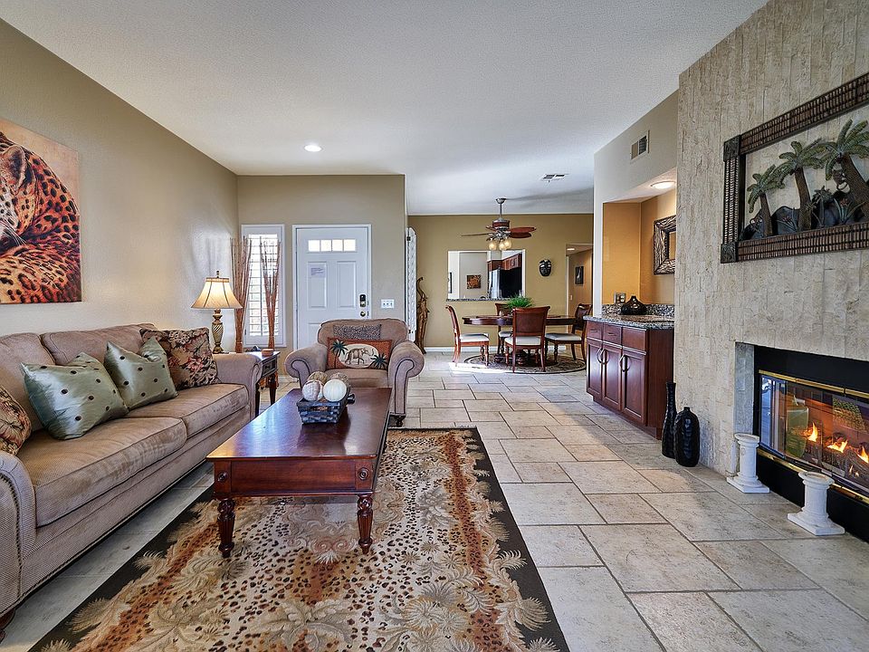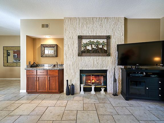 Discover the epitome of Palm Desert living in this exceptional first floor, 2-bedroom, 2-bath single-story condo, nestled within the sought-after Desert Falls community. Boasting a tasteful remodel with a captivating tropical motif, this serves as an oasis in the heart of the desert, offering a balanced blend of style and comfort. This beautiful move in ready condo is being sold furnished, offers granite countertops, ceiling fans, plantation shutters, upgraded bathrooms, kitchen, tile flooring, all showcasing a commitment to quality and style. The inviting living room features a cozy fireplace and plush furnishings, creating a warm and welcoming atmosphere. Step outside onto the private patio, a serene space for al-fresco dining or simply savoring the tranquil desert surroundings and just feet away from the pool and spa. Culinary enthusiasts will appreciate the updated, eat-in kitchen with stainless steel appliances, perfect for preparing delightful meals, and the adjacent dining room provides an ideal setting for shared culinary experiences. A laundry room, complete with washer and dryer, as well as a two car garage complete the home. Situated just steps away from one of the numerous community pools, this condo invites you to relax and unwind in style. The gated Villas at Desert Falls goes above and beyond with an array of amenities, including cable package and high-speed internet with Spectrum, 25 pools, spas, tennis courts, gardening, landscaping, and watering of the common areas, on-site management, and 24-hour manned security and gates.