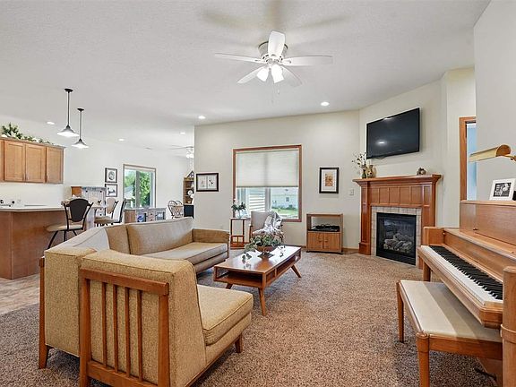 Gently lived in single family home with zero step entry, this is a great find in WB! Built on a slab, this home offers a spacious, desirable, open layout. The kitchen has beautiful maple cabinetry, an eat at island and a desk/coffee bar area as well. Walking in from the garage is a nice laundry room with lots of cabinets and a utility sink. Dining room slider opens out to a nice patio and to the back yard. A gas fireplace, with TV placement option above gives a great focal point for the living room. The primary bedroom has an en suite with a large walk in closet that doubles as a concrete storm shelter. Two additional bedrooms and another full bath complete the floor plan. This 3BR home has floor heat, and central AC. The garage also has heated floors! Lots of perennials around the property to enjoy, and a nice flat yard, easy to maintain. *The assessor site has the property information incorrect, this is a 3br 2ba home.
