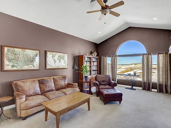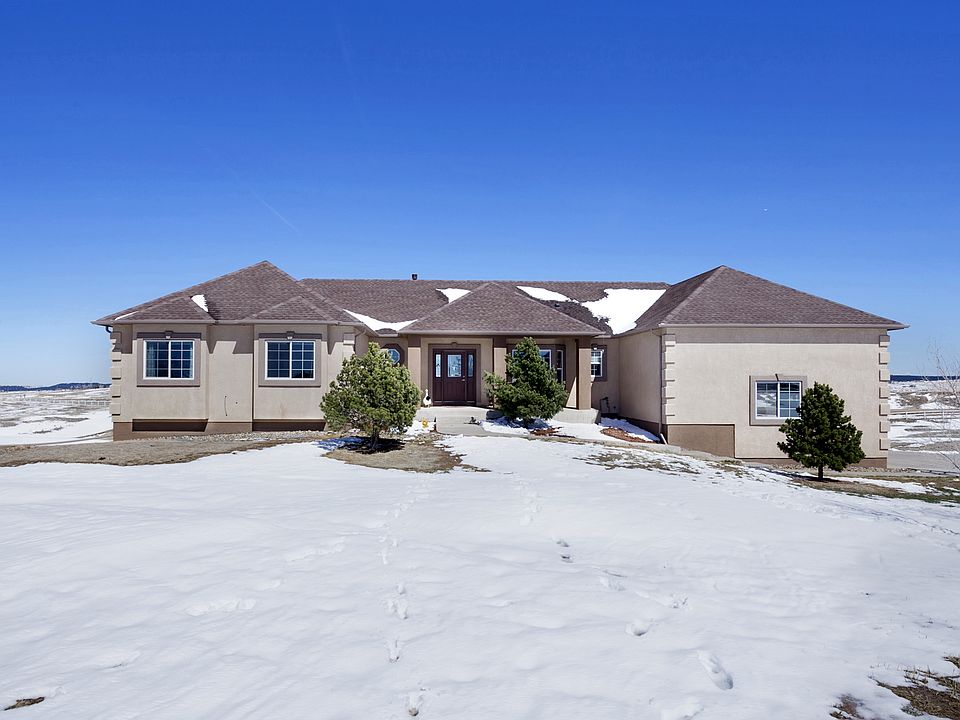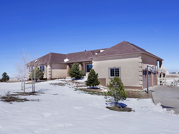 Beautiful Walkout Rancher on 5 acres of rolling meadows, zoned for horses with wide open views. A long, fully paved and landscape lined circle drive welcomes you to what could be your slice of Colorado... featuring large picture windows, gourmet kitchen, two balconies, and custom built in grill. Rich custom cabinetry, hickory floors, granite slab, stainless steel gourmet appliances with wine cooler, and 2 sided river rock fireplace complete the open kitchen/greatreat room with the feel of luxury.