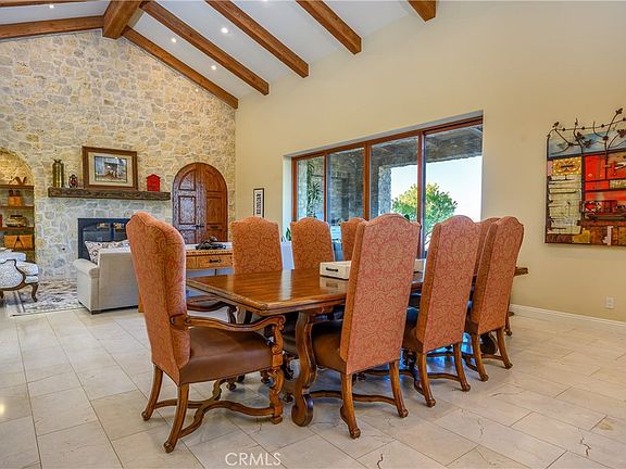 Inside, natural light pours through arched windows, illuminating marble stone flooring and a grand arched door. A massive fireplace and soaring vaulted ceiling with natural wood beams are grounded by a limestone feature wall. The California outdoor room via vanishing La Cantina glass doors seamlessly integrates indoor and outdoor living, offering endless views and the changing colors of the landscape.
