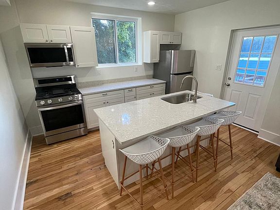 Available June 1st. Welcome home to your beautifully renovated two bedroom one bath apartment on a wooded property nestled on the edge of upper Lawrenceville. This fully renovated apartment comes with a new kitchen with white shaker cabinets, quartz countertops, and LG stainless steel appliances including dishwasher. The kitchen living room combo is perfect for entertaining with a kitchen island, tasteful exposed ductwork, and gorgeous hardwood oak flooring that is all throughout the apartment. Nicely updated bathroom with tile, vanity, medicine cabinet and lighting fixtures. There is an in unit stackable washer dryer, and forced air system with central heat and air conditioning. 2 Off street parking spots are available per apartment on this quiet property with a large outdoor area back in the woods to enjoy the fresh air. Patio space and porch are included with each unit. Cats allowed, no dogs. 45/month per person fee for water and sewer. Tenant puts gas and electric in their name. No Smoking. Tenant pays gas, electric, and water. No Dogs No smoking Off Street parking Security deposit due with first month rent