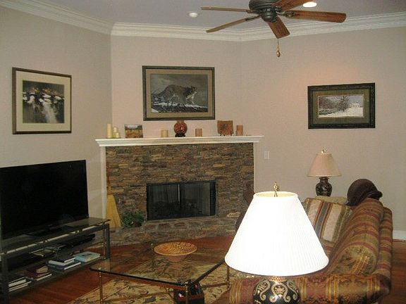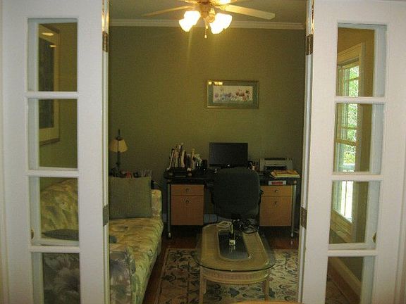 Gorgeous kitchen w/breakfast bar, hardwood flooring, gas stove top, granite counter tops & pantry. Sep. formal dining room w/chair rails & trim. Great room has stacked stone fireplace w/gas logs. Sun room w/french doors, chair rails and wainscoting. Oak flooring in all areas except bedrooms & baths. Large master suite w/walk-in closet, whirlpool tub, sep. tiled shower & marble dbl vanity. 2-car attached & detached garage w/heated & cooled office w/.5 bath on sep. septic tank, work bench, storage