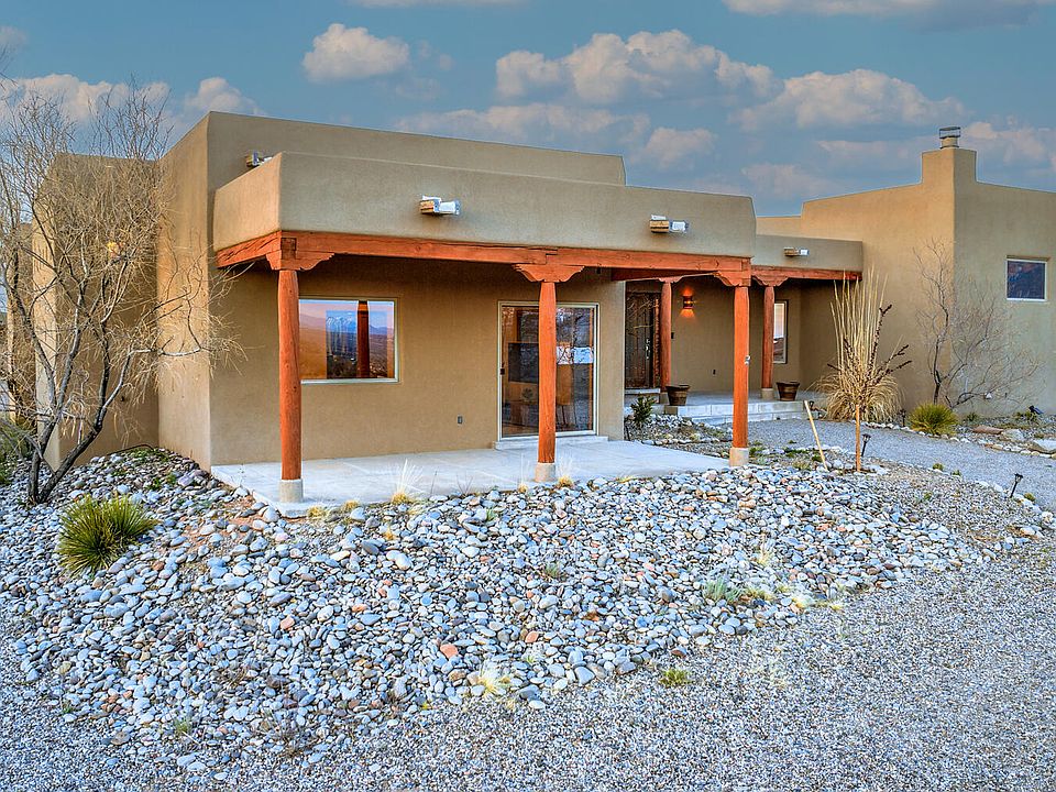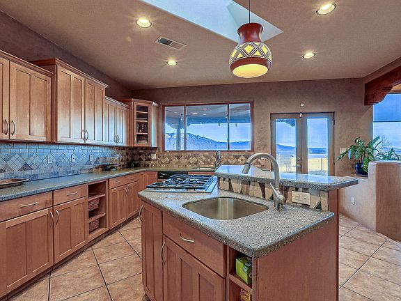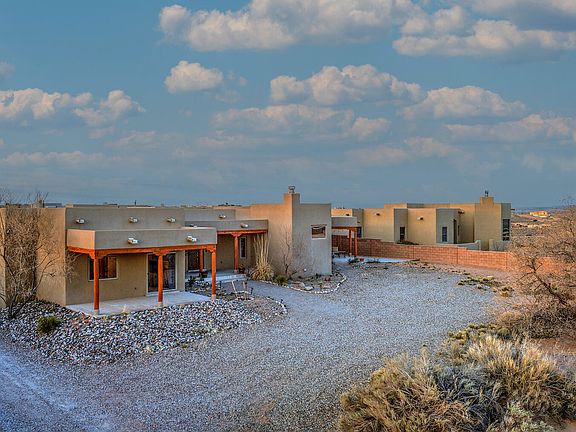4400 square feet SW style home with unobstructed views of the Sandias from the living room windows, 4 large BR, primary bedroom has new tile floors and huge closet. Massive kitchen w/island, huge pantry & separate eat-in dining. Solar w/27 panel system 8.64kw. Open floor plan with venetian plaster walls, nichos & rustic S/W wood beams on ceilings. Big laundry room w/sink & storage, 7 zone Radiant heat plus forced air heat & A/C. Well pump replaced 2018, 150 gallon water heater replaced in 2018, new court yard with turf, camera doorbell, new roof in 2018 w/warranty, new septic 2018. RV garage plus an oversized 3 car w/insulated garage doors, 240 plugs in both garages. Huge extra bonus room currently used as a theater room or can be converted to a gym. The3/4 acre lot has new walls & patio.