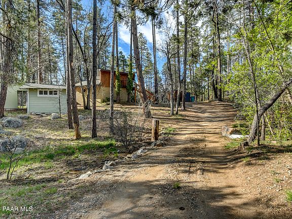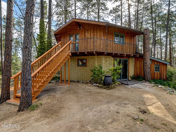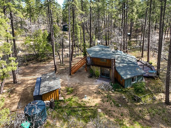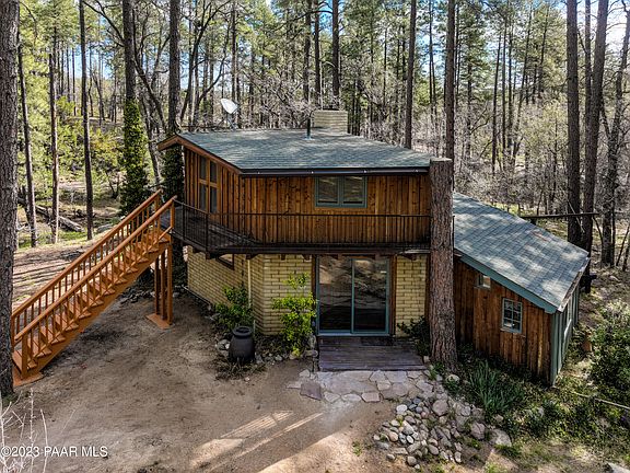 Peaceful and secluded escape in the pines sitting on an acre of land and backing the Prescott National Forest. The roads are paved all the way to the home and less than 15 minutes to downtown Prescott! Upgrades include: Custom railing on 2nd balcony with interior access or use the separate entrance from the outside. 50 gallon water heater installed in 2019, travertine and custom flooring recently installed tile, new pellet stove/mantle and rock work, water storage tank, power loss detection generator with auto start, reverse osmosis drinking waters system, work-out room that can be a shed/office/artist studio, safety enclosed insulated dog house/kennel, exterior refreshed laundry room, new interior paint, freshly stained/oiled decks and logs. Fully remodeled baths. Horses are allowed.