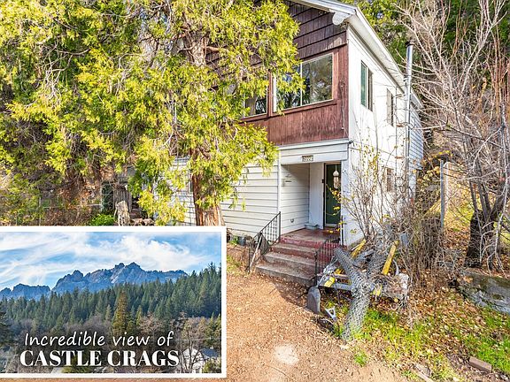 Tucked among towering pines in the heart of Dunsmuir, directly across from the Sacramento River this charming mountain home is full of potential and the ideal escape for those who love the outdoors. Located just minutes from hiking trails, waterfalls, and world famous fly fishing; all while still being close to restaurants and small town amenities. Bedrooms are located on the second floor, with an enclosed porch providing a sunny retreat. The property offers a wonderful garden area and sheds for storage or potential creative space. Don't miss the fantastic view of Castle Crags from the flat terrace towards the back of the property. Square footage is per the tax records and should be independently verified.
