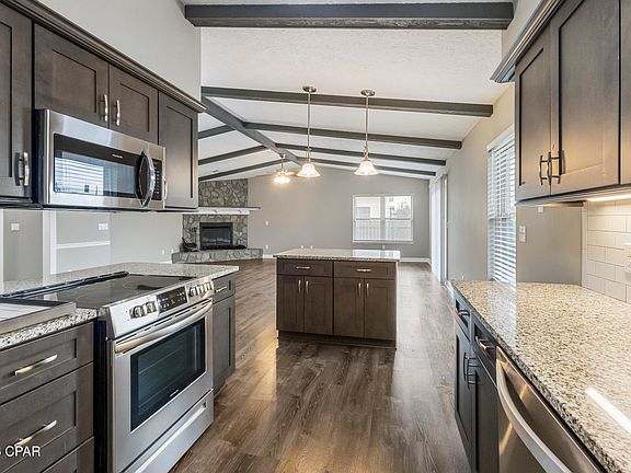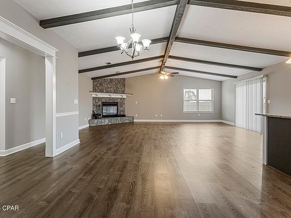 BEAUTIFUL BRICK HOME NEAR TYNDALL AFB! This well-maintained home offers 3 bedrooms, 2 full baths, and nearly 1,800 square feet of comfortable living space. The open floor plan with a vaulted beamed ceiling provides a bright, spacious living, dining, and kitchen area suitable for everyday living or entertaining. The kitchen features granite countertops, stainless steel appliances, wood cabinetry with soft-close hardware, a center island, two breakfast bars, and a walk-in pantry. Luxury vinyl plank flooring is found throughout the main living areas, with carpeting in the bedrooms. Additional features include a 2-car garage, a wood-burning fireplace, a tankless gas water heater, an ADT security system, a 220-volt power source, professionally tinted windows (excluding bedrooms) for added energy efficiency, and new hurricane shutters. Situated on a corner lot, the exterior features attractive landscaping, an irrigation system, a privacy-fenced backyard, and oversized parking suitable for extra vehicles or a boat. This home is conveniently located approximately 4 miles from Tyndall AFB and is near restaurants, schools, parks, shopping, public boat ramp, and Mexico Beach. With numerous updates throughout, this home is a must-see. Schedule your private showing today!