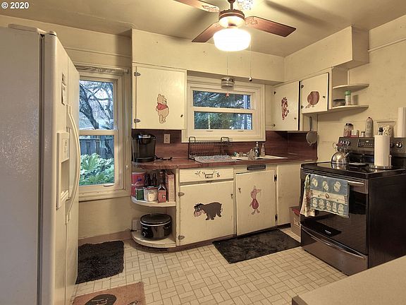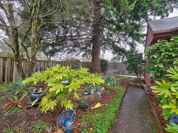 Mid century charmer with coved character boasting in the living room ceiling and hallways. Updated electrical, windows, converted garage space to 3rd bedroom or flex space, hardwood floors in living, hall and entryways. Gas heating and new range/oven.Bountiful additional storage space in attic, dedicated laundry room with utility sink and door to exterior covered storage space opening to a fully fenced large yard with fire pit, tool shed with oversized deck for outdoor living enjoyment.Must see! [Home Energy Score = 4. HES Report at https://rpt.greenbuildingregistry.com/hes/OR10188191]