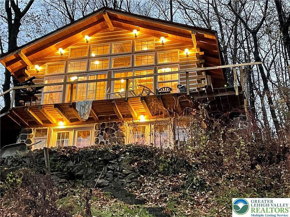 OFFERS DUE BY SATURDAY 11/29 3PM. Fully renovated in 2024, this handcrafted log home with dock space offers a rare blend of privacy, and riverfront living. Tucked at the end of a quiet cul-de-sac and bordered by a dramatic rock cliff, the setting feels both secluded and spectacular - no HOA fees. The open-concept kitchen, dining area, and great room flow beneath timber beams, while an open loft adds additional living space. Three levels are connected by two custom built wood spiral staircases—leading from the loft to the main great room and down to the finished lower level. This walkout level features a pair of 6-foot-wide French glass doors that open to a patio and paved path leading directly to the river. Every room offers river views, and barn-door-style room dividers add both charm and privacy. Additional highlights include rich wood ceilings, cedar closets, exposed timber framing, a cozy wood stove, and new top-of-the-line appliances. There is a split system for heat/ac. With indoor-outdoor living —and the Delaware River just steps away—this home delivers a truly exceptional retreat and is just 74 miles to NYC, and 86 miles to Philadelphia! Close to downtown Easton for great restaurants, entertainment and farmers markets. Quick closing possible!! Selling as-is.