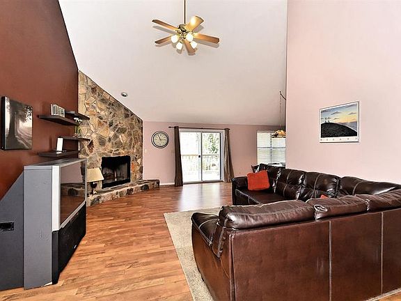 Spacious ranch home in Tega Cay, SC with 2 car garage. Large great room has vaulted ceiling and stone fireplace. New laminate wood floors, new roof, new heating & cooling system, and new sliding door leading to rear deck. Fenced back yard backs up to a wooded greenbelt area. Large crawl space. Fort Mill Schools.