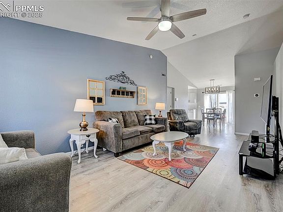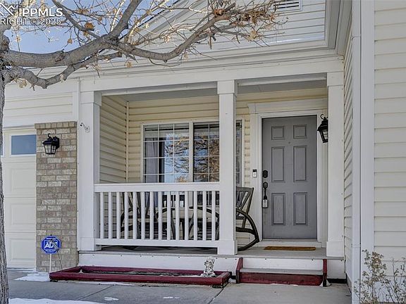 Welcome to the cutest house in all of Ridgeview at Stetson Hills! From the moment you arrive, you can't help but notice the inviting covered front porch and curb appeal. As you enter the home, you'll notice the tall, vaulted ceilings, the open floorplan, the natural light that pours in, and the lovely luxury vinyl flooring that flows through the living room and kitchen. There are 2 bedrooms to the right with a full bath in between. The primary bedroom is spacious and boosts a large window that overlooks the backyard, an adjoining bath, and walk-in closet. Both bathrooms have newer flooring. Now for the lovely kitchen...this space has been beautifully updated with white cabinets and black accent knobs, speckled granite countertops, a large sink, a newer dishwasher, and a pantry. The dining space opens up nicely to both the kitchen and living space while also providing direct access to the backyard. The yard has been beautifully maintained and a perfect space to get away and enjoy the 300+ days of CO sunshine. This home has so much to offer including a prime location, just a few steps away from the neighborhood park, a short distance away from restaurants, shopping, and several military bases.