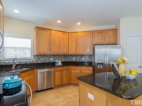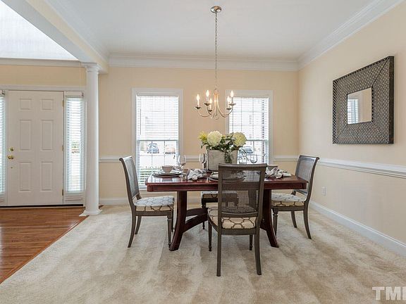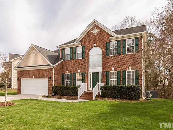 Lovely 4bd/2.5ba brick front home in desirable Northeast Raleigh community. Main floor formals: living rm, dining rm, family room w/gas logs fireplace, office. Kitchen w/granite counters, tile backsplash and breakfast area. Huge master w/sep sitting room. Master bath with dual vanities. Nice rear deck opens to spacious yard. Freshly cleaned carpets. Home located adjacent to large wooded green space. Community features pool, tennis courts, playground and greenway access.
