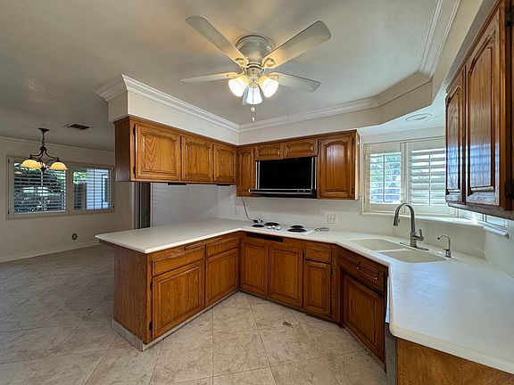 This beautifully updated Northwest home offers 3 well-sized bedrooms, 2 bathrooms, and a large den, which is fully carpeted and equipped with AC perfect for use as a 4th bedroom or additional living space. The home's thoughtful layout provides both comfort and functionality. The expansive backyard is a standout feature, featuring a large pool, covered patio, and a gas fireplace, ideal for creating a serene outdoor retreat. The space is designed for easy maintenance and provides plenty of room for both relaxation and future customization. Additional highlights include a covered carport and dedicated RV parking, offering convenience and flexibility. With its solid construction, spacious interior, and desirable outdoor amenities, this home is a must-see for those looking for both comfort and practicality. CA DRE 01993295 12 month lease required Security deposit due upon approval 14 days to move in upon approval