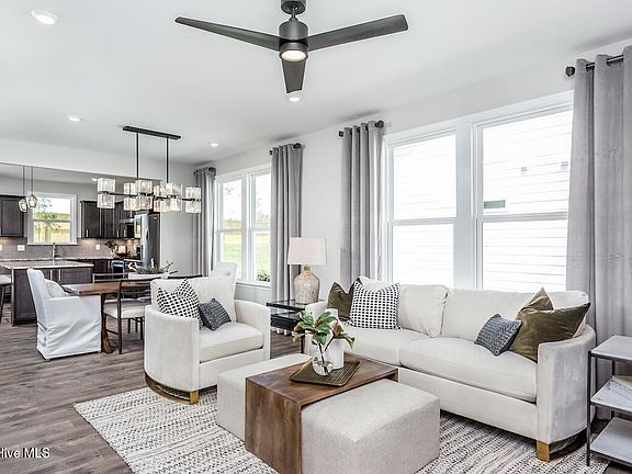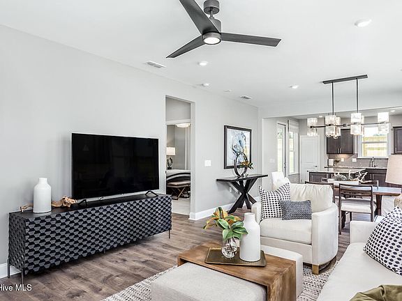 Exceptional new-construction, single-level homes by builder Pulte Homes only 8 miles from Carolina Beach in The Haven at Riverlights! Being the closest new-home community to the beach who offers ranch-style homes, plus the ease of included lawn care and amenities, you won't want to miss this lovely Compass. This Compass floor plan is 1,403 sq ft and features 2 bedrooms, 2 full bathrooms, a versatile flex room, and covered patio plus extension. The kitchen has been upgraded to feature 42'' upper cabinets with a soft close feature, Miami White quartz countertop, a gas range, tile backsplash, upgraded pendant lights, and an island that's perfect for gathering and extra counterspace. From the kitchen, there is a sliding glass door to offer a lovely transition onto your covered patio. In the owners' suite you will enjoy the upgraded vanity and quartz countertop, an upgraded shower tile surround, in a beautiful Calacatta white, with a tile shower pan to match. The owner's suite hosts a tray ceiling which adds elegance and comfort to the space. The second bedroom, full bathroom, and flex room are toward the front of the home offering some separation from the owners' suite. The home features a 2-car garage with a 4' garage extension. Included in the home are Smart Home features that include two dual drops (data and cable)- one in the gathering room and another in the owners' suite, a digital, programmable thermostat, video camera doorbell, and a tech cabinet for easy hookup of all your devices. Visit The Haven at Riverlights to make this home yours! We have an on-site Sales Consultant there seven days a week and two beautiful model homes to tour!