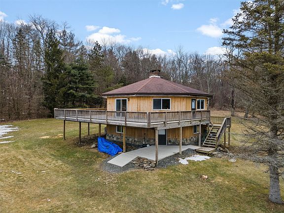 Welcome to this unique and stunning octagon-shaped house on 20 acres of beautiful property! As you step inside this custom-built house, the two-story stone fireplace immediately catches your eye and draws you in, it's truly the heart of the home. The open floor plan on the main floor is perfect for entertaining, while the ground floor features a spacious area with a cozy fireplace. The large windows offer breathtaking views of the surrounding wildlife.