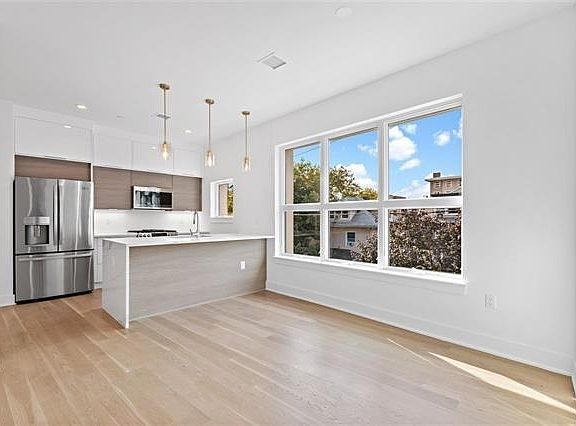 This stunning modern one-bedroom offers a perfect blend of style and functionality. Designed with ample storage, it features double bedroom closets, a linen closet, and a coat closet. The sleek open kitchen maximizes space with two-tone cabinetry, custom marbled Quartz countertops with a striking waterfall edge, and natural oak hardwood floors. A full suite of GE Profile appliances, including a fully vented range hood, completes the contemporary design. The spa-like bathroom exudes elegance with a floating white lacquer vanity, an LED-lit mirror, and luxe finishes. Enjoy the convenience of an in-unit full-size Whirlpool washer and gas dryer. Residents also have access to a private garage with assigned parking for $175 per month, a gorgeous lobby, a spacious fitness center, and a welcoming lounge. Available April 1st.
