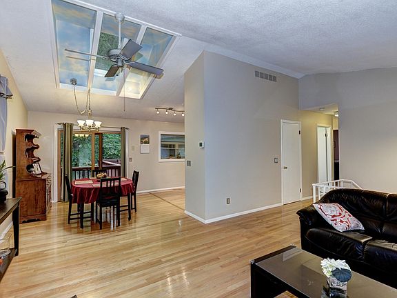 Downstairs the original family room has a fireplace and a basement walk out. There is a utility room and the entrance to the two car garage. A bonus cedar storage under the stairs! The rear addition provides a full bath and a huge bonus master bedroom with new floor and Pella sliding door. This area is private and could be a perfect au pair suite, a multipurpose room, or a teenagers' hide out. A multi-tier deck in back lets you enjoy the fenced yard and the walk/bike paths just on the other side of the fence.