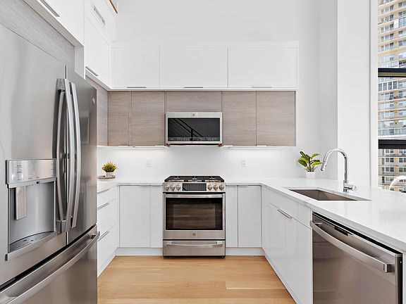 Available October 1st! Make the newest luxury residence on prestigious Blvd East in over 40 years your new home! Get wowed with the architectural design and best quality construction in all of Hudson County. This modern 1 Bed / 2 Bath / loft is meticulously designed with plenty of closet space and amazing floor-to-ceiling windows. The cabinets in the open kitchen maximize the storage space while incorporating a sleek modern look using two-tone cabinetry. The white lacquer uppers and lowers with textured grey mid cabinets along with the custom marbled Quartz countertops and its striking waterfall edge complements the natural oak hardwood floors. A full suite of GE Profile appliances is perfected with the installation of a fully vented range hood for cooking. Elegant chic continues in the bathroom creating a space that is both refined and functional with a floating vanity and LED-lit floating mirror. Baths are clad in large-format porcelain tile and feature luxe finishes and fixtures. A full-size Whirlpool washer and gas dryer are also in every unit. Amenities for residents: a private garage with assigned parking, a gorgeous lobby/ lounge, a spacious and inviting exercise room, and a comfortable common library. Just a key turn away, your future home is ready for move-in! Great neighborhood, transportation to NYC on the corner, close to all shopping, restaurants, and essentials.