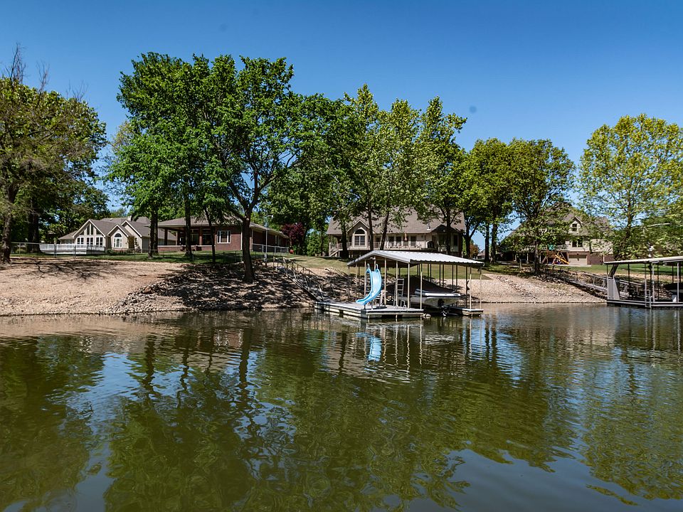 Charming waterfront home in Patricia Island Estates and Golf Club. 110' of gentle slope lakefront, covered boat dock 10'x22' slip, wood deck with covered area & open deck area to enjoy the lake views. Quality built home features spacious living room, gas log fireplace, new carpet, Lake views, newly remodeled kitchen, granite counter tops, stainless appliances, 5 burner gas cooktop, Island work space, eating bar, breakfast nook overlooking the lake. Formal Dining room just off the kitchen, office just off entry can also serve as a 4th bedroom. Master suite on the main level, lake views, deck access, private bath features double sink vanity, new ceramic tile shower w/clear glass door, whirpool tub and huge walkin closet. Upper level features huge family room, 2 Guest bedrooms and full bath