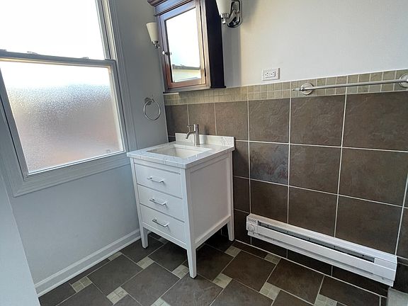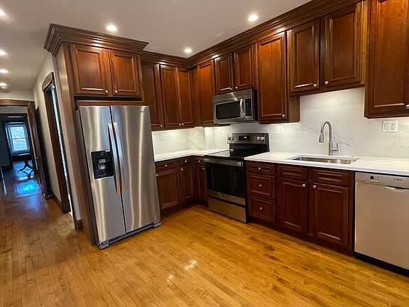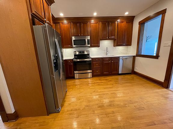 This newly painted 3-bedroom, 2-bathroom property offers 1,400 square feet of living space. The living room provides ample space for relaxation and features air conditioning for comfort. The updated kitchen is equipped with a dishwasher, stainless steel appliances, newly installed quartz counter top, enhancing convenience for meal preparation. Each bedroom is designed for functionality, with sufficient storage options available throughout the home. The bathrooms are well-maintained and provide essential amenities. Additional features include an in-unit washer and dryer, central air, 9 ft ceilings, hardwood floors, lots of closet space. Garage parking for 4 cars Property does not qualify for housing voucher. Credit score of 650 required. The location property is a short 9 minute walk 3 minute drive from/to a super market, right across the street you will find a small market and cafe. There a restaurants and bars within walking distance. Convenient to transportation: 15 minute ride to the Kennedy and the 80 / 91 bus will take you to the blue line in 20 minutes Tenant(s) responsible for gas, electric, and internet. Non-refundable move-in fee of $500, security deposit. and first month's rent are due at lease signing. Pets are welcome on a case-by-case basis. Schedule your viewing today. Owner pays for water. Tenant responsible for gas and electric. $500 moving fee. First month rent and security deposit of $2,500 due upon signing.