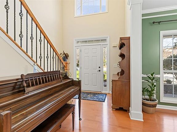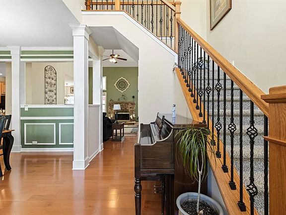 Lovely traditional style home with spacious floor plan in an award-winning school district! Home features a 2 story foyer, wrought iron staircase, hardwoods and formal dining room. Beautifully updated eat-in kitchen with wood cabinets, granite countertops and black stainless steel appliances. Kitchen opens to a 2 story great room with fireplace. Primary suite on the main has a vaulted ceiling and updated primary bath which features double sinks, granite countertops, wood cabinets, separate soaking tub, tiled shower and a large walk-in closet. A secondary bedroom, full bathroom and laundry room are conveniently located on the main. Upstairs are 3 generously sized bedrooms and a full bathroom. Enjoy the private wood setting and tranquil creek from your front porch or your back patio. Home is on a level lot and is fully fenced. Brand new shed stays with the property. Enjoy the community pool and tennis courts.