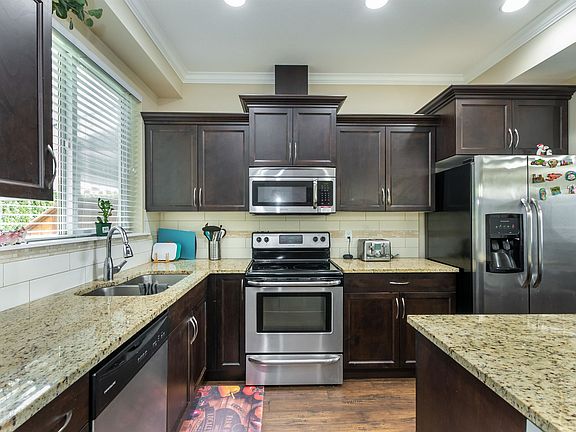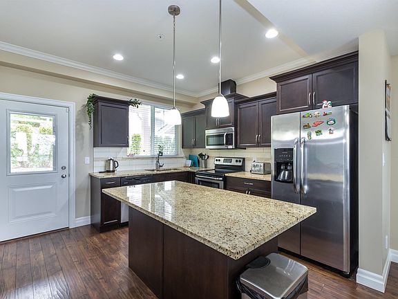 3 Bed + Den and 3 Bath end unit With Panoramic Views of the valley. This former showhome is loaded with extra features. Main floor boasts large family room with natural gas fireplace, Den Kitchen with Quartz countertops and huge pantry, access to private back yard and panoramic views of the Valley from the living room. Upper floor has 3 bedrooms including a luxurious Master Bedroom with ensuite washroom and walk-in closet and private deck with amazing views. Double car garage with lots of room in the back for a third car park and 2 car parking on driveway. Still under Home owner's warranty. Complex allows 2 pets and Rentals allowed. Property is tenanted for $2700/month plus Utilities. Tenant already has notice to move out but wants to stay if Buyers allow.
