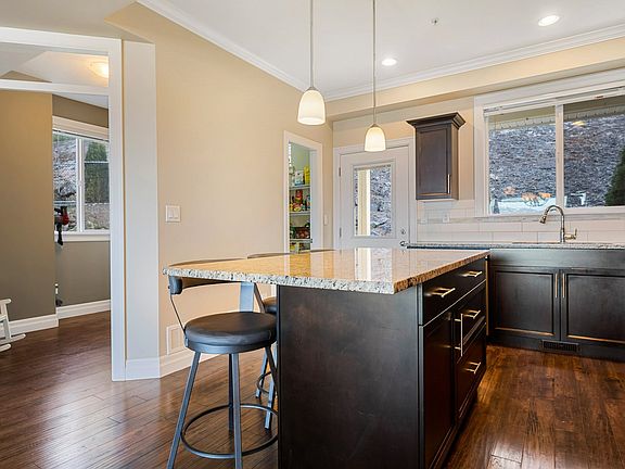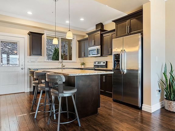 UNOBSTRUCTED VALLEY VIEWS from all floors. 3 bedrm, 3 bthrm END UNIT! The main floor features an open concept kitchen with S/S appliances, an island with seating & a large pantry. The dining area flows into the living room w/a gas fireplace & access to a balcony that overlooks the valley and there's a den for extra space! Upstairs the primary bdrm feels bright & airy w/access to a private balcony, a spacious W/I closet & an ensuite w/dble sinks & large shower. There are also 2 additional bdrms & full bthrm. The large double garage has a built in storage & just behind the garage is bonus room that could be used for additional storage or rec room. Outside the semi private yard has a covered patio area w/gas hookup! This home also has A/C & EV charger! Great location close to trails & parks!