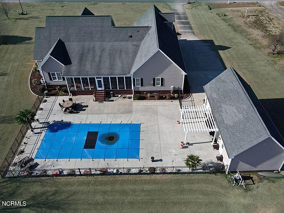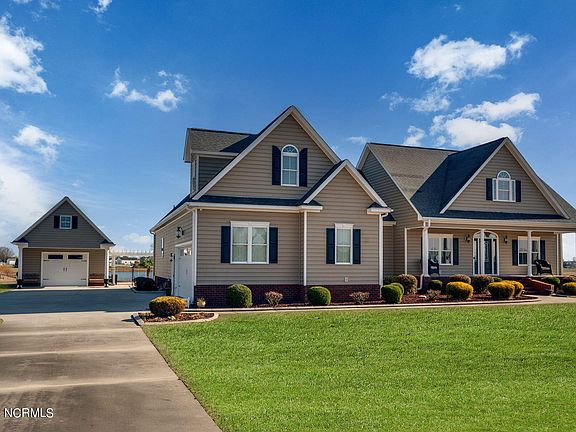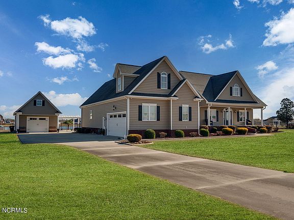 A stunning example of quality construction. Lake front with views of the other two lakes! Enjoy your morning coffee and afternoon beverage sitting on your dock! Gleaming real hardwood floors throughout living areas. Office has pocket doors, built in desk and shelves. Large formal dining room has beautiful hardwood floors with inlayed pattern. Spacious den has fireplace with gas logs and vaulted ceiling. Kitchen has well thought-out placement of custom cabinets with ample storage and counter space. High end appliances - 6 burner gas cook top and double ovens. Large breakfast room with a fabulous view of the lake. 3 bedrooms down stairs including the spacious master bedroom with trey ceiling. Master bathroom has jetted tub, walk in shower, and 2 walk in closets. Even the laundry room and the bathrooms have granite counter tops. Upstairs bonus room has a 3rd full bathroom and walk in closet. Don't miss the enormous walk in attic with shelving. Relax or entertain in the heated and cooled EZ Breeze porch which is large enough to accommodate a crowd. Enjoy the salt water pool with family and friends (pool pump was replaced in 2023). The home has a 2 car attached garage PLUS a 1 car detached garage with upstairs loft. The detached garage loft would make a great game room or simply use it for storage. The pergola completes the outside oasis and provides the perfect place to relax, read a book, or entertain. This home is as functional as it is beautiful. It has been meticulously maintained and features insulated vinyl siding, a tankless water heater, sound system, irrigation, and regular maintenance from Wheeler pest control. And did I mention the LAKES? Bring your paddle board, canoe, motor boat, or fishing poles and enjoy the water year around! Just minutes from major roads, Greenville, Kinston, Goldsboro, and New Bern.