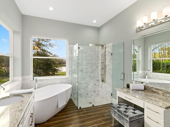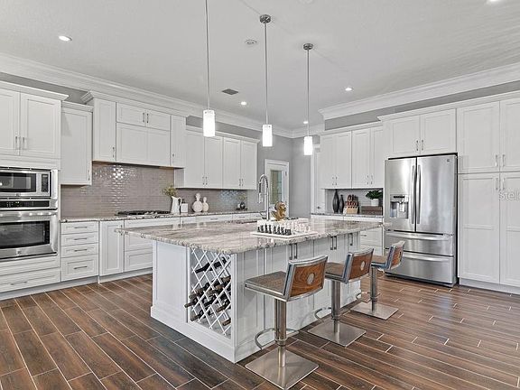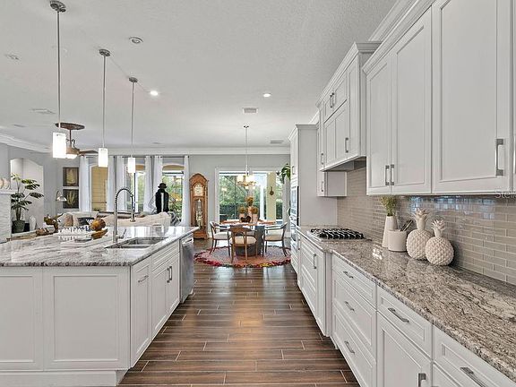 Beautiful renovation recently completed! NEW AC just installed October 2019. Modern interior styling and top of the line finishes makes this 6 bedroom /4 full bathroom home a unique gem in the highly sought after community of Keene's Pointe. The enjoyment begins as you step onto the huge covered front porch. Enjoy your morning coffee or evening wine on the covered lanai to the panoramic 11th fairway and pond/fountain views of the famous Jack Nicklaus Signature Golf Course. Oversized master suite features a double sink vanity and 3rd makeup vanity, free standing tub, custom frameless glass shower and built in closet organizers. Plenty of cabinet space in the custom kitchen and bathroom cabinets, including 42" soft close doors. Premium Low-E double pane energy efficient windows, solid core wood 8 foot doors, and crown molding throughout. Luxurious granite and tiled backsplash combined with new stainless steel appliances makes the kitchen a chefs dream! Custom tiling throughout the house, including detailed marble wall tiling in all 4 bathrooms. Modern wood-look tile floors in the main living areas and master suite, new carpet in bedrooms. New landscaping, irrigation system, interior and exterior paint in 2018 to complete this full renovation. The list goes on! It is the responsibility of the buyer to verify square footage.