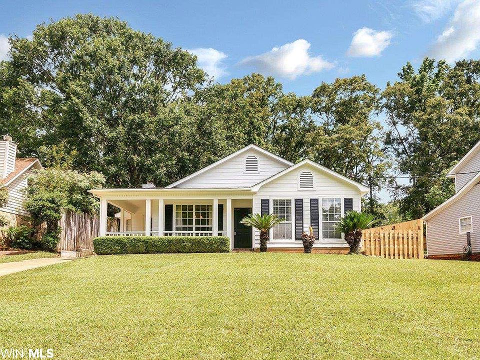 Roof Replaced in 2017 with architectural shingles, exterior of home was painted in June of 2021. This lovely 3 bedroom, 2 bathroom home has the best layout and is located on a huge lot for the area. Oak Harbor Subdivision is tucked away and quiet yet located right in the heart of West Mobile. The front porch is large and covered. Step into the front door to the hallway/foyer area with laminate wood flooring and a coat closet. The formal dining area is off the foyer. The formal dining also offers wood laminate flooring, chair rail and crown molding with a large double window for overlooking the front porch and yard. The kitchen area has tile flooring and offers a good amount of countertop space and cabinets. The breakfast area is connected to the kitchen and there is an adorable bay window with window seating and storage under the window seat. There is another door off the kitchen/breakfast room allowing for additional access to the front porch area and driveway. The living area is great with a brick fireplace, wood laminate flooring and assess to the large backyard area. The master bedroom is spacious with a large walk-in closet. Take the last door off the hallway by the living room and you will find an additional hallway with wood laminate flooring, another hall closet and this is where the secondary bedrooms, guest bathroom and laundry area all located. The secondary bedrooms are nicely sized and offer nice closets. Plus, one of the secondary bedrooms has its own private assess to the bathroom. Step outside to the large backyard with a large patio area for entertaining. Just off the back is a storage room to accommodate your outdoor storage needs. This home has been well loved by the existing owner, but it is time for new owner(s) to make this their home and "New Beginning". ***Listing Agent makes no representation to accuracy of sq. ft. Buyer to verify. Any and all updates are per Seller(s).***