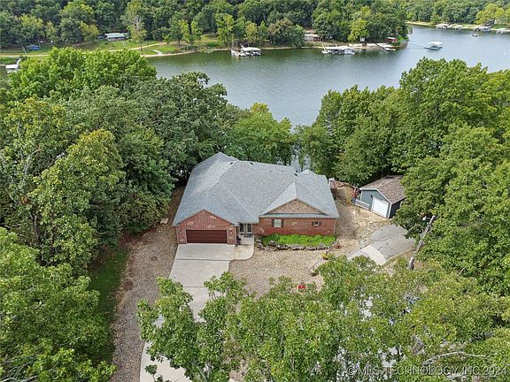 LAKE FRONT LET'S GO! Escape to your own lakeside paradise in the heart of Grove, Oklahoma at this stunning lake house located in the serene Honey Creek area. No HOA and no rental restrictions, this beautiful retreat boasts 2035 sqft of living space with 3 bedrooms and 2 bathrooms, nestled on two large lots totaling 1.04 acres of prime lake frontage. Step inside to discover an open concept layout designed for seamless entertaining, featuring an expansive kitchen with ample cabinet space, elegant granite countertops, and large windows that offer breathtaking views of the tranquil surroundings. The high ceilings add a sense of grandeur to the space, while the large master suite is a true sanctuary with a cozy fireplace, luxurious master bath, and a spacious walk-in closet. Outside, the covered back deck is a perfect setting for hosting gatherings, complete with areas for grilling, relaxing in the hot tub, and cozying up around the fire pit. Additionally, a 30 x 60' well-built shop with a 12' x 60' lean-to provides ample storage and workspace, equipped with power, water, concrete slab and insulated, offering potential for a second living quarters. For water enthusiasts, the property includes a boat dock with power and water, two boat slips and lifts, as well as a swim deck party space featuring a wet bar, entertainment area, fish cleaning station and outdoor shower and toilet. This property is move-in ready, allowing you to start enjoying lake living right away. Conveniently located just around the cove from Honey Creek Marina and a short 8-minute drive to downtown Grove, this is a rare opportunity to own a piece of lakeside paradise in a coveted location. Option to buy fully furnished with the right offer! Additional features: MistAway Insect Systems, storm cellar, roof 1.5 years old, newer hot water tank, hot and cold hose fixtures.