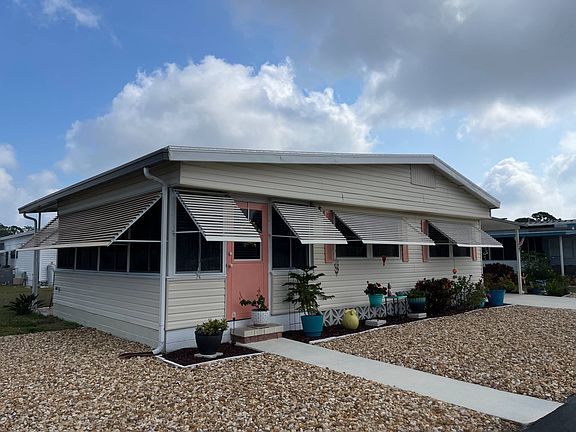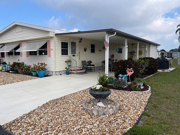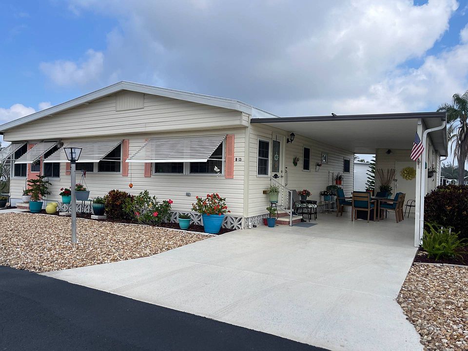 Step in to the Florida beach vibe house! You'll feel like you're on vacation when you walk in the door. No disappointments here because this home is being offered turnkey furnished, even down to the comforters on the beds. Hard surface flooring is through out every room with a cool color palette in each room. The dining room comfortably seats 4 and is open to the living room and kitchen area. Decorator updates in the kitchen, giving you plenty of counter, space, and, updated appliances, including a dishwasher. The living room will host casual conversations with friends while the enclosed lanai creates a cozy TV nook, as well as a great work-from-home office. There's plenty of storage with two hall pantries. The guest bathroom includes a shower/tub enclosure. The guest bedroom has two twin beds, bright light, and double width mirrored closet doors. The primary bedroom has double closets and a built-in dresser along with a washer & dryer closet. Your en suite bathroom has a tile stand up shower enclosure and large linen closet. Step outside and enjoy the outdoor living with patio nooks and barbeque pads. There's a storage shed at the end of the carport for all your beach toys. AC bout 4 years old and NEW membrane roof under warranty! This home is centrally located in Bradenton, just A few miles north of the Sarasota Bradenton International airport and about 15 minutes to Gulf Coast beaches. Bayshore Windmill Village is a gated, land lease, 55+ community with clubhouse, swimming pool, shuffleboard, pickle ball, library, pool table and organized activities. Lot Rent is $957 and includes lawn maintenance and park amenities. Background check and approval is required. The community is pet free with the exception of emotional support or service animals with physicians documentation. Sub-renting is not allowed. AGENT MUST SHOW BY APPOINTMENT 603 63rd Ave W Lot B-13 (B Avenue) Bradenton, FL 34207