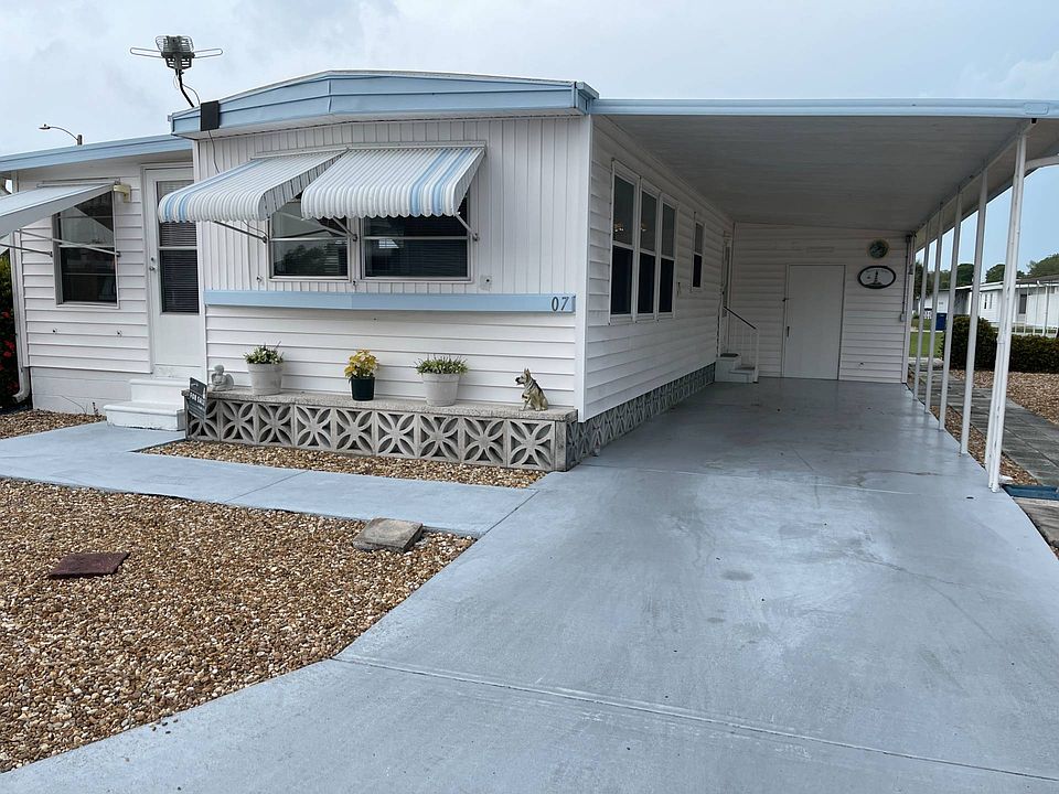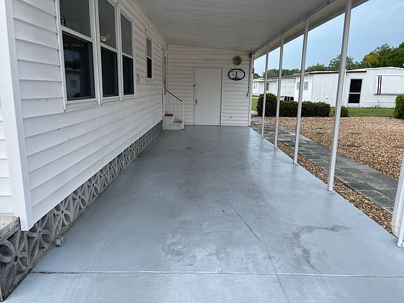 Bayshore Windmill Village is 55+ community with clubhouse, swimming pool, shuffleboard, library, pool table and organized activities. Make this charming home yours; sold turnkey furnished. New windows, updated flooring, updated bathroom and enclosed lanai adding double the width to the living area of this home. Everything has been well maintained and is ideally set up for easy care whether you are a Florida snowbird or year round resident. Outside you'll find a double extended shed providing ample laundry space (including the washer and dryer) as well as an 8x10 workshop and shed area. To the rear of the home is a nice sunny patio for enjoying the Florida life! Carport has a long extended driveway with plenty of parking for 2 cars. The lot has been landscaped with large stones, making it an easy care property. Available to show. This is a 55+, land-lease park.