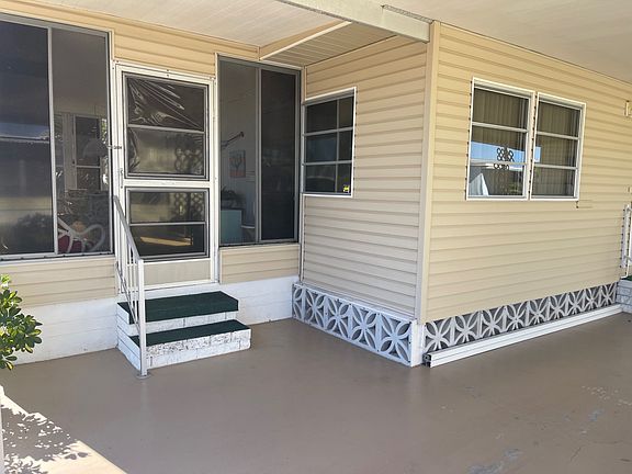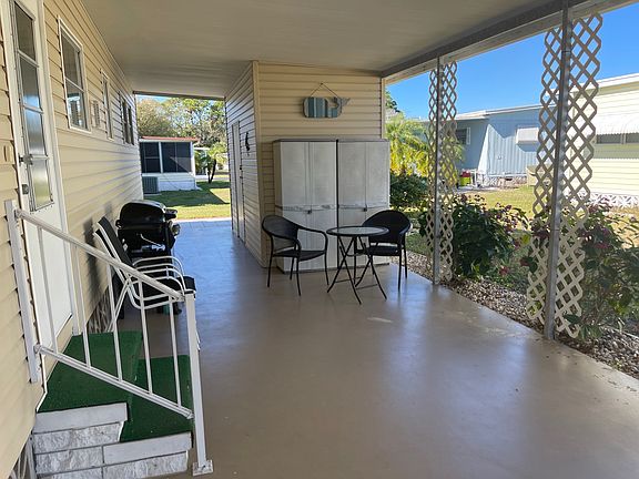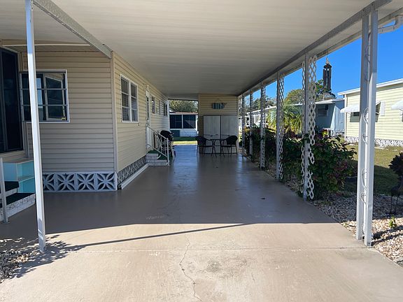 Make this impeccably maintained home yours. Pride of ownership shows in all the details and improvements that have been done. Decorated in a fresh beachy Florida style, there are two bedrooms and two bathrooms, completed with an east facing lanai. Everything is included in this turnkey gem! Enter through the bright kitchen with plenty of storage, tile counter tops and a dishwasher. From there, you are enjoying the large living room and dining room open floor plan. Notice the fun and freshly painted walls and the driftwood colored laminate flooring throughout. The furnishings are in good taste an condition. If you need a little work space, a handy desk has it's place. Enjoy the morning light with the large east facing lanai. The Florida style continues through to the roomy guest bedroom and bathroom. The primary bedroom offers a private bath with stand-up shower. Plenty of closet space and storage throughout. Outside, the details don't stop! The carport has extra long length, leaving plenty of room for cars as well as a barbeque and seating area. Located in the storage shed is your washer and dryer along with plenty of beach and pool toys to complete the fun. If that isn't enough, there's a sunny west facing patio to catch additional sun! All around this home you'll see how carefully it has been maintained, right down to the skirting border and landscaping. Located in the center of the community, there are very few cars making it very quiet and private. Worth noting is the AC replaced in 2018 and tented in 2020. The home is a 1972 with 984 sq ft under air. This home is centrally located in Bradenton, just A few miles north of the Sarasota Bradenton International airport and about 15 minutes to Gulf Coast beaches. Bayshore Windmill Village is a gated, land lease, 55+ community with clubhouse, swimming pool, shuffleboard, pickle ball, library, pool table and organized activities. Lot Rent is $957 and includes lawn maintenance and park amenities. Background check and approval is required. The community is pet free with the exception of emotional support or service animals with physicians documentation. Sub-renting is not allowed. AGENT MUST SHOW BY APPOINTMENT 603 63rd Ave W Lot V-2 Bradenton, FL 34207
