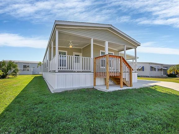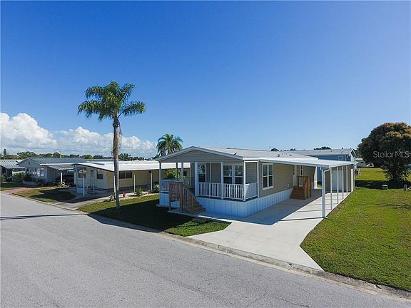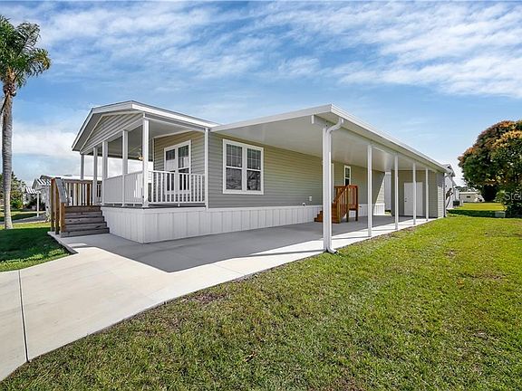 This brand new manufactured home by Champion / Homes of Merit is ready to move in! Two bedrooms, two bathrooms with a den. Many upgrades; extra double width front porch with ceiling fan and Trex decking. Stainless steel appliances. Both bathrooms have a walk in shower - master bathroom shower has a low step in with large glass barn door style. Walk in closets. Vinyl wood look tiles through out entire house. Open plan. Neutral colors. All drywall with rounded edges - no strips. Double pane windows. Indoor laundry. Long double carport with shed. Manufacture warranty. Bayshore Windmill Village is a gated over 55 active community; heated swimming pool, clubhouse, library, shuffleboard, generous lot sizes with wide open streets. Note: As a new home, sales tax will be collected on the home only (not on the Share/land value). Agent is also Dealer and Community Manager.