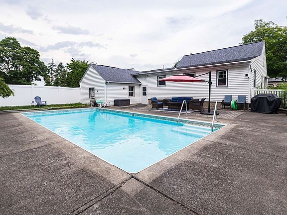 Welcome to this charming 1500 sq ft Cape Cod home situated on a spacious, fenced corner lot. Featuring an inviting in-ground pool, this residence offers 2 bedrooms and a full bath on the main level, with a third bedroom and walk-in closet on the second floor. Square footage does not include the finished basement bedroom with a full bath, an electric fireplace, and a walk-out to the garage. Basement also features a game room! The open kitchen with eat-in dining flows seamlessly into a formal dining area with a fireplace, perfect for gatherings. Don't miss out on this beautifully maintained home!