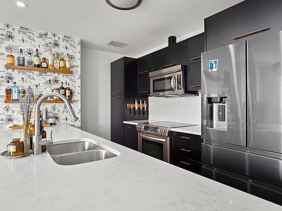 Stunning condo in heart of Rainey Street. Spacious, 1bdrm/1bath + Den, featuring open floor plan, upgraded wood floors & fantastic views. Recently remodeled/updated kitchen and bath. Kitchen features new quartz countertops and backsplash, custom shelving, new fridge, SS appls & a large kitchen island to gather around. Relax in the mstr bdrm w/full bath, walk-in shower & closet. Amenities include pool, fitness center, 24hr concierge, secure parking, conf room on 1st floor available for residents use. Google Fiber avail. Next to Hotel Van Zandt, walk to Rainey & Lady Bird Lake. Lockbox w/ concierge in lobby.