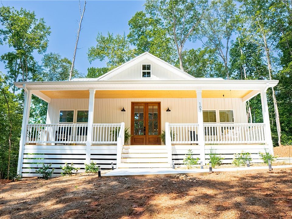 Welcome to your new sanctuary, a stunning 1180 sq. ft. Bed / 2 bath new construction home that seamlessly blends modern luxury with natural beauty. As you step through the oversized wood-stained front door, you're greeted by vaulted ceilings in the open concept living space, creating an expansive and airy atmosphere. Beneath your feet, stylish luxury vinyl plank (LVP) flooring adds elegance and practicality. The charm continues outside with an inviting wood porch stretching along the front and a back deck that overlooks serene woods, perfect for both relaxation and entertaining. Inside, you'll discover two spacious bedrooms, two beautifully appointed bathrooms, and an oversized laundry room that doubles as a versatile office space. The heart of this home is the designer kitchen, boasting a beautiful shiplap wall, white shaker cabinets and gleaming quartz countertops,?with stainless steel farmhouse sink and appliances, marrying functionality with modern aesthetics. This is more than a house; it's a lifestyle waiting for you to embrace. Schedule a showing today and make this unique space your own. Your dream home awaits!
