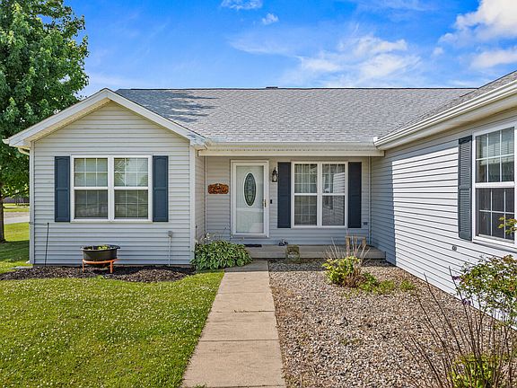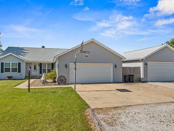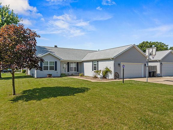 Extremely functional and spacious, this 3 bedroom, 2 bathroom ranch offers over 1,800 square feet of living space and a desirable split floor plan-with the primary suite on one side and two additional bedrooms on the other. The open-concept living, dining, and kitchen areas feature vaulted ceilings that enhance the bright, open feel. Enjoy the added bonus of a heated sunroom, perfect for year-round use. Step outside to a back deck and a concrete patio that connects the detached garage to the home. With both an attached and detached garage plus a garden shed, storage and workspace are plentiful. Major updates in 2021 include the roof, HVAC, and water heater. A move-in ready home that blends comfort, functionality, and outdoor enjoyment.