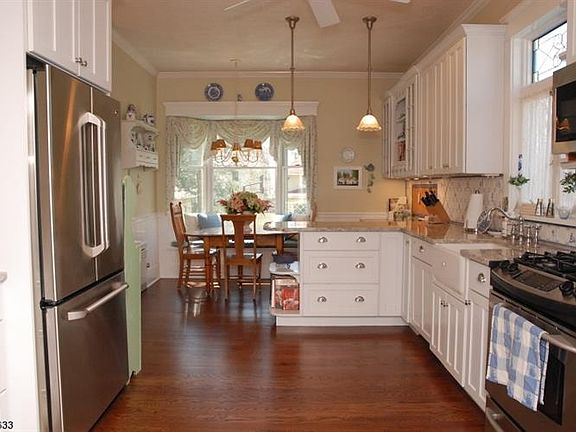 Stately turn-of-the century Victorian Colonial featuring a covered front porch, spacious and airy rooms with high ceilings and detailed woodwork. Premier North-side location. Wood Floors throughout. Formal LR room with wood burning fireplace. Generous formal DR with French doors. Updated kitchen features a butler's pantry, separate eating area, granite counter tops, hand painted back splash tiles, SS appliances and large walk-in food pantry. First floor mud room and laundry area. Second floor bedrooms include MBR suite with separate dressing area with sink and large walk-in closet. Master bath features a pedal sink and jetted tub. Third floor has 5th and possible 6th bedroom with stained glass windows and built-in window seats. Finished basement with family room, recreation area and full bath.