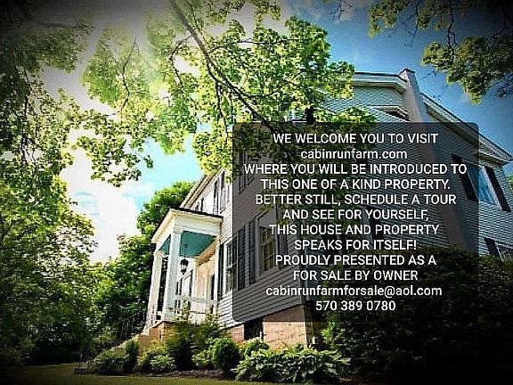 Please contact the owners directly at cabinrunfarmforsale@aol.com. You are encouraged to visit our dedicated website at cabinrunfarm.com for a comprehensive introduction to this property. Proudly presented for sale by the owners. OFFERED AT $699,000. The historically significant 'Aikman House', circa 1869, has been meticulously restored with every amenity for today's family. The present owners have been stewards of this significant property for over 23 years. This truly unique home sits on 8 groomed acres, which includes a spring fed pond, the original working spring house, and an inground pool. The grounds are appointed with a variety of trees, perennials, and a collection of hostas. Conveniently located near two entrances to I-80 and close to I-81, this property enjoys a private setting convenient to a diverse community with year-round activities, a university, and Geisinger Medical Center. Additional restored buildings onsite allow for convenient and private 'work from home' locations! You are invited to visit our comprehensive website, cabinrunfarm.com, for a tour of the property and an introduction to this one-of-a-kind residence. To schedule a private tour, please email us at cabinrunfarmforsale@aol.com FYI and for your convenience, a direct link to cabinrunfarm.com is located at the bottom of the Zillow listing page. Email: cabinrunfarmforsale@aol.com/570-389-0780. We look forward to your visit!