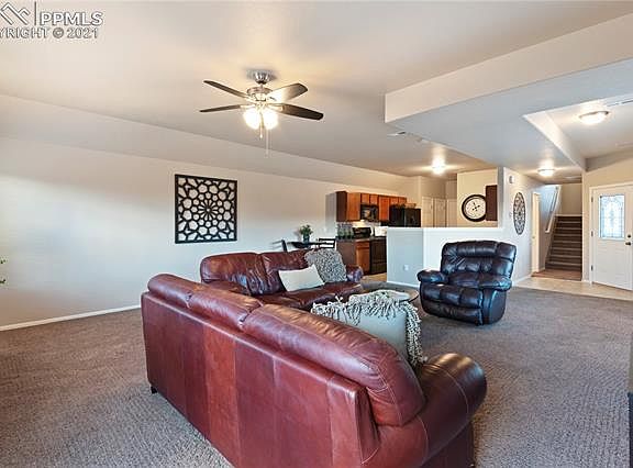 Welcome home to this charming 3-bed, 3-bath, 2-story, end unit townhome with an attached garage, Central AC, and Pikes Peak views. You will love the bright open floor plan in the Great Room that walks out to the large patio enclosed with a privacy fence. The Kitchen is open to the Great Room for easy entertaining, has tons of cabinets, and a pantry. The spacious upper level Master Suite has fantastic mountain views, includes a walk-in closet with built in shelves and an adjoining 5-piece Master Bath with double vanity, generous soaking tub, and a separate Master Shower. The upper level has a large landing that is perfect for a sitting area. Two additional bedrooms and a full guest bath complete the upper level. The laundry room with built-in shelves is conveniently located upstairs and the washer and dryer are included. This home has all the storage space you need. There is a green space just steps outside the front door and the home backs to the newly paved Sand Creek Trail with no neighbors behind you. The home is in the well-maintained Brant Hollow community, convenient to the Powers shopping corridor and Peterson Air Force Base. Do not miss out. This home will not last long!