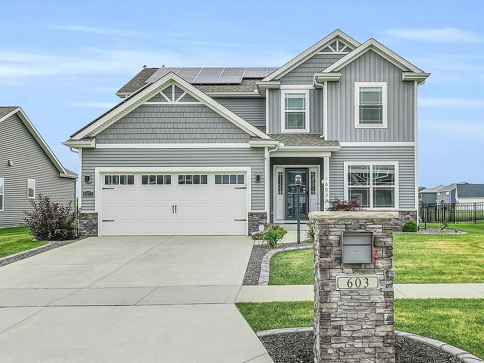 High quality Ironwood Madison house is waiting for its new owners at the popular Liberty on Lake Subdivision! The house offers 5 bedrooms and 3.5 bathrooms with 2 car garage and finished basement. The first floor provides an open floor plan with a flex room, dining area, kitchen and a mudroom off garage w/built-in bench & lockers. Kitchen features a large granite island with bar stool seating, walk in pantry, and stainless steel appliances. Stepping up to unique open staircase, you will see 4 bedrooms and laundry room upstairs. Master bedroom features large walk-in closet, double sinks, custom tiled shower. Finished basement has extra family room, a 5th bedroom, and a full bathroom. Sitting under two pergolas at the fence backyard, you will enjoy the gorgeous sunset surrounded by the professional landscaping. The fully paid solar panels save you tons of utility bills. The irrigation system makes your lawn care very easy. Plus Tesla Wall Charger inside the garage and Stone Column Mail Box. Mitigation system is installed too. Don't miss this great house!