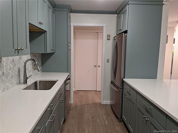 Smokey Blue cabinets in a kitchen- absolutely stunning This Heritage Model located in Heritage Village 55+ Community in Southbury, Ct. This unit is a short distance from the garage and has 6 steps to the door.Two bedrooms two full baths and a garage. The updates are beautiful with an open floor plan and quartz countertops. The fireplace is wood burning and the heating and cooling system have been updated to the ventless splits. There is a new hot water heater as well The guest bath has floor to ceiling tiles and the shower has river rocks on the bottom. The Master bath has a double walk in shower with beautiful glass barn door. New windows throughout except for the bathroom and this model has an extra window in the LR for a view of the golfcourse and more natural light. Come check out this up to date unit in Heritage Village.