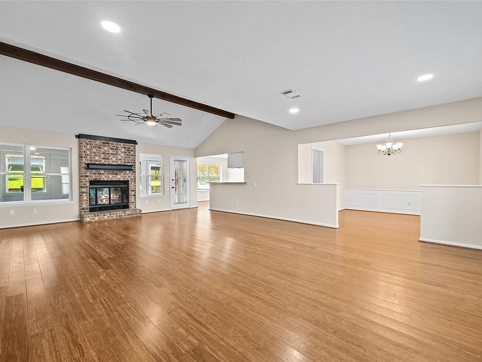 Welcome to this renovated beauty in Elkins Lake! This 2039 sq ft home offers 3 bedrooms, 2 full baths, kitchen with double ovens, wood flooring, and a luxurious master bath with custom vanity. Updates include a new roof, granite countertops, and newer appliances. Enjoy the community amenities like golf courses, swimming pools, tennis courts, walking trails, and more. The property features a brick exterior, spacious living room with wood-burning fireplace, formal dining area, a large yard, and a patio for outdoor relaxation.