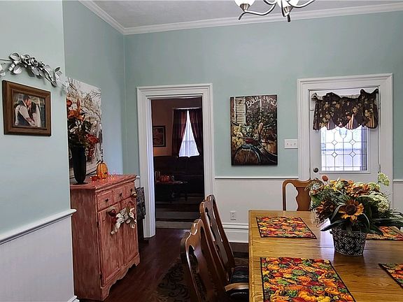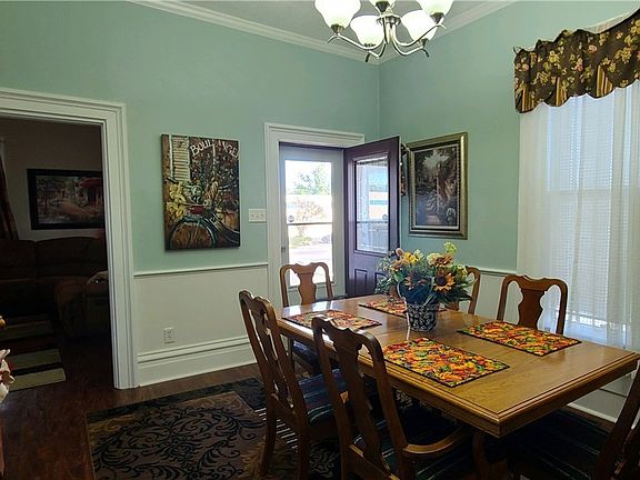 What a warm inviting home with all the charm of a two story home. The front porch wraps around two sides of the home allowing for great space for relaxing and entry into this beautiful home. The dining room has wainscoting, crown molding, beautiful woodwork and 10 ft ceilings as well as the living room which also has a beautiful fireplace and mantle to showcase your decor. The updated eat-in kitchen has stylish black cabinets with newer coordinating appliances and white subway tile backsplash. The family room could be used for a 4th bedroom or office. The utility room and spacious spa style bathroom is conveniently located on the 1st floor. Upstairs 3 bedrooms with paddle fans and spacious closets and another full bath with shower. Home has newer Window World vinyl windows, new metal copper color roof and matching downspouts and gutters with guards. Welcome Home!