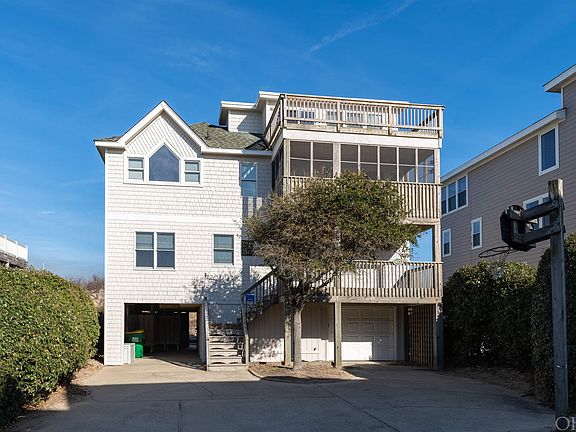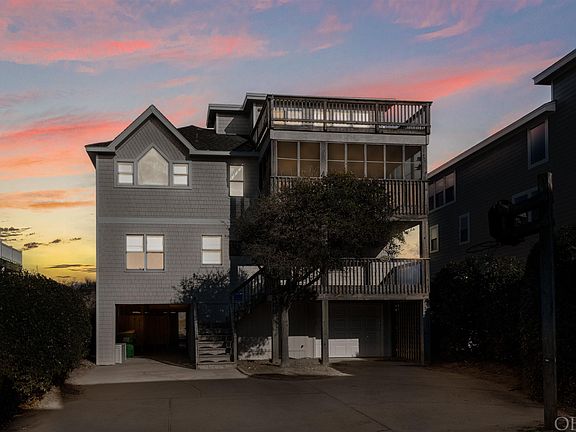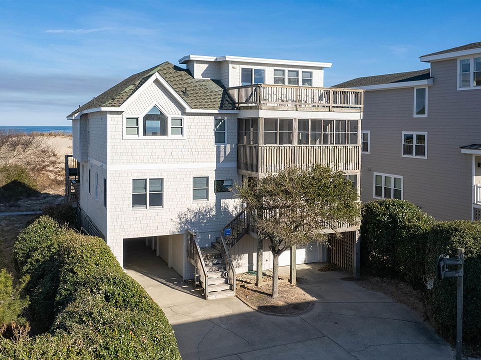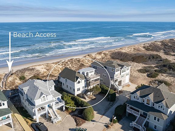 Panoramic views of the ocean and coastal charm can be found throughout this oceanfront cottage situated in Section O of the Ocean Sands community of Corolla. An Olin Finch build, this home offers quality craftsmanship and thoughtful design with 6 bedrooms (4 en suites), 6 full baths, a game room, garage, tiki bar, and shared direct access to the beach. On the ground floor, a game room w/ custom shelving, foosball, a full bath, and bedroom with two duo bunk sets is the perfect place for kids to relax and unwind after a day spent at the beach. On the second floor, four en suites, two with direct deck access, an oceanside hot tub, bright foyer entry, and covered decks provide an inviting and cozy place for guests to rest their heads and relax. The third floor boasts expansive views of the oceanfront with surrounding windows, spacious decks to soak up the warm ocean breeze, a large open concept living room w/ gas fireplace, built-in shelving, and ample seating, a kitchen w/ stainless steel appliances, island, dining & breakfast seating, a wet bar, full bath, reading nook, and screened porch for entertaining. Draw straws for the opportunity to spend your evenings in the top-level bedroom with two twin beds, a trundle bed, and private rooftop deck for sunbathing. With direct shared beach access, close proximity to the community pool & tennis, a well-established dune line, and an accommodating size for 2+ families, it's no wonder this is a sought-after vacation destination for guests year after year!