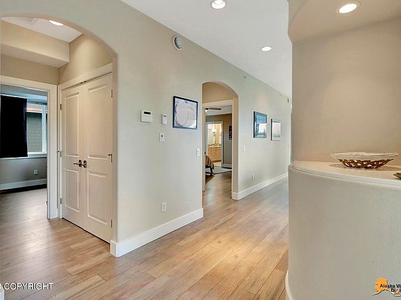 Beautiful top floor Bootleggers Cove condominium with Inlet and mountain views located approximately one block from the Coastal Trail. Positioned for abundant natural light and enjoying the evening sunshine on your West facing deck. This attractive floor plan has all living on one level enhanced with 9' high ceilings. The gourmet kitchen features solid wood cabinets; Wolf & Miele stainlessappliances; quartz countertops; and a large island with wrap around serving bar. Great room has custom shelving and cabinets surrounding the gas fireplace. Spacious primary bedroom, bathroom, and California Closet designed to maximize storage. Second bedroom has built-in cabinets, Murphy bed, and office desk. Private elevator from your entry to the oversized two car garage. The garage has room to park two full sized vehicles as well as have space for storage and/or projects. Five Star Plus Energy Rating; in-floor radiant heat; sprinkler system; security system; North side secured entry shared with only one other owner; plus a Home Warranty provided.