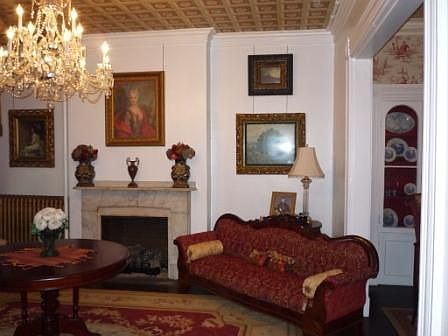 Beautiful Federal style 1842 brick in Galena s historic district. Home restored to its original grandeur. This beautifully decorated home features formal living and dining with beautiful woodwork, crystal chandeliers and a fireplace in each room. Gourmet kitchen with imported Italian limestone floors, Vermont soapstone sink and countertops. Commercial grade stove/oven with water spigot for your large cooking pots, and exhaust system. Wet Bar with wine cooler and prep sink. Family room continues from the kitchen with limestone floor and gas fireplace. Charming conservatory w/curved brick wall full length windows overlooking private courtyard accessible from the kitchen. Beautiful staircase leads to Master suite with 2 fireplaces, cherry wood floors, and private bath. Spacious second bedroom and laundry on second floor. Continue to third floor to another bedroom. Parking in rear to accommodate 3 cars.