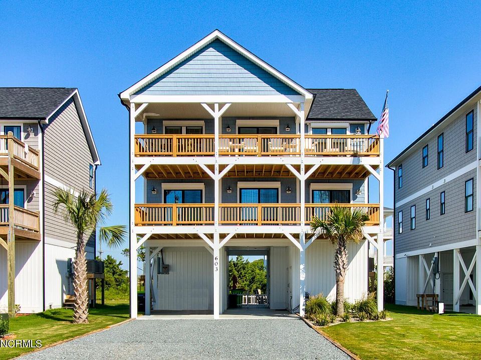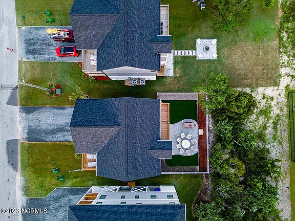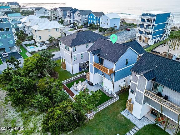 Make yourself at home with expansive Atlantic ocean views in this three-level, 4 bedroom, 3 bathroom, furnished home, with elevator. The home has never been rented and is ready to move in. Built in 2022, the home is conveniently located close to the Surf City bridge, on South Shore Drive inside the S-curve, second-row from the beach with beach access just across the street. Features include a bright, open floor plan, great room with vaulted ceilings, custom kitchen with granite countertops and stainless steel appliances. Upgrades added include WiFi and remote controlled hurricane shutters, and a whole-house generator with three owned propane tanks. The maintenance free fenced backyard includes a paved patio with propane fire pit, inset and overhead lighting, artificial grass and river rock in the hard to reach maintenance areas. An enclosed 12' x 14' storage area was added on the ground-level with climate controlled foam and additional electrical receptacles, which could be used as a large owner's closet or workshop. Enjoy all the best of island living from one of Topsail's most desirable locations.